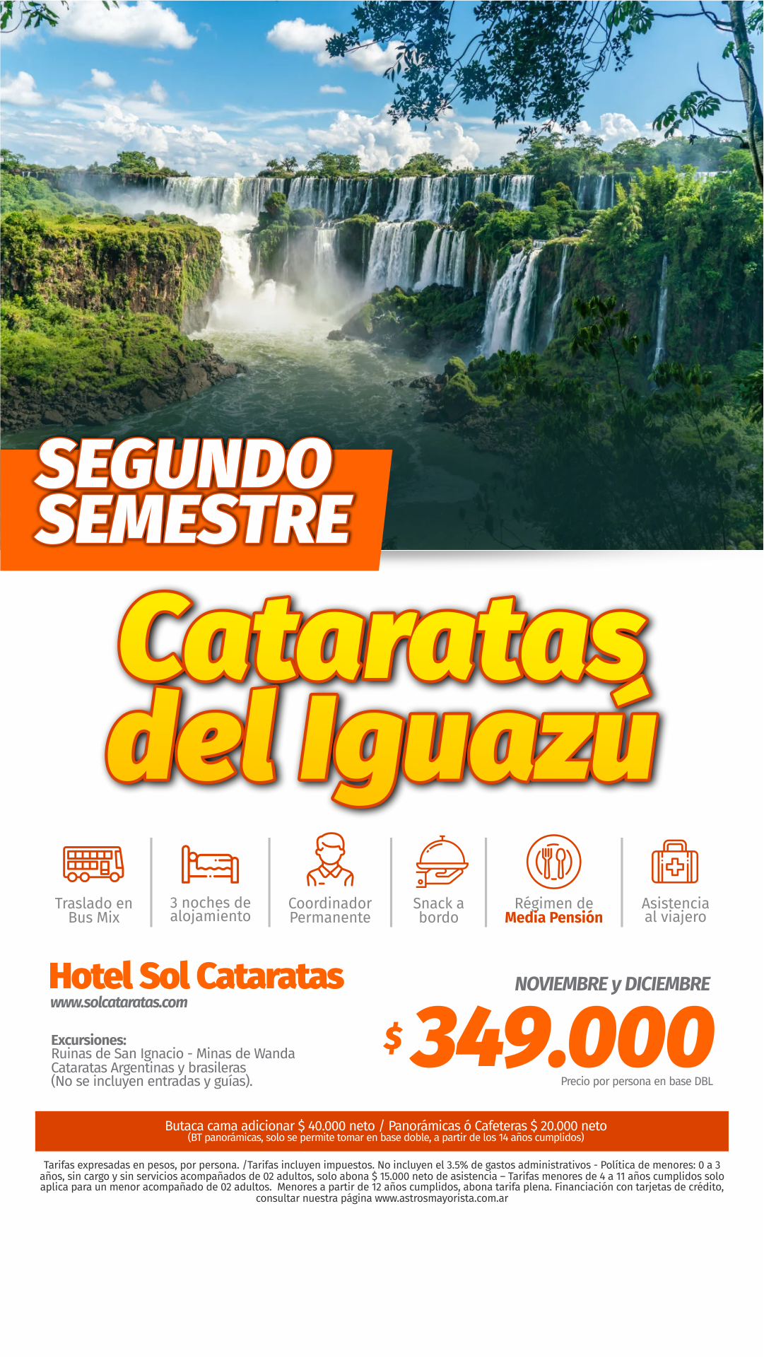 Tarifas expresadas en pesos, por persona. /Tarifas incluyen impuestos. No incluyen el 3.5% de gastos administrativos y de reserva. Política de menores: 0 a 3 años, sin cargo y sin servicios acompañados de 02 adultos, solo abona $ 15.000 neto de asistencia - Tarifa de menores de 4 a 11 años solo aplica para un menor acompañado de 02 adultos. /Financiación con tarjetas de crédito, consultar nuestra página WWW.ASTROSMAYORISTA.COM.AR