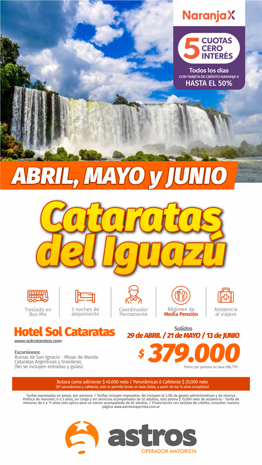 Tarifas expresadas en pesos, por persona. /Tarifas incluyen impuestos. No incluyen el 3.5% de gastos administrativos y de reserva. Política de menores: 0 a 3 años, sin cargo y sin servicios acompañados de 02 adultos, solo abona $ 15.000 neto de asistencia - Tarifa de menores de 4 a 11 años solo aplica para un menor acompañado de 02 adultos. /Financiación con tarjetas de crédito, consultar nuestra página WWW.ASTROSMAYORISTA.COM.AR